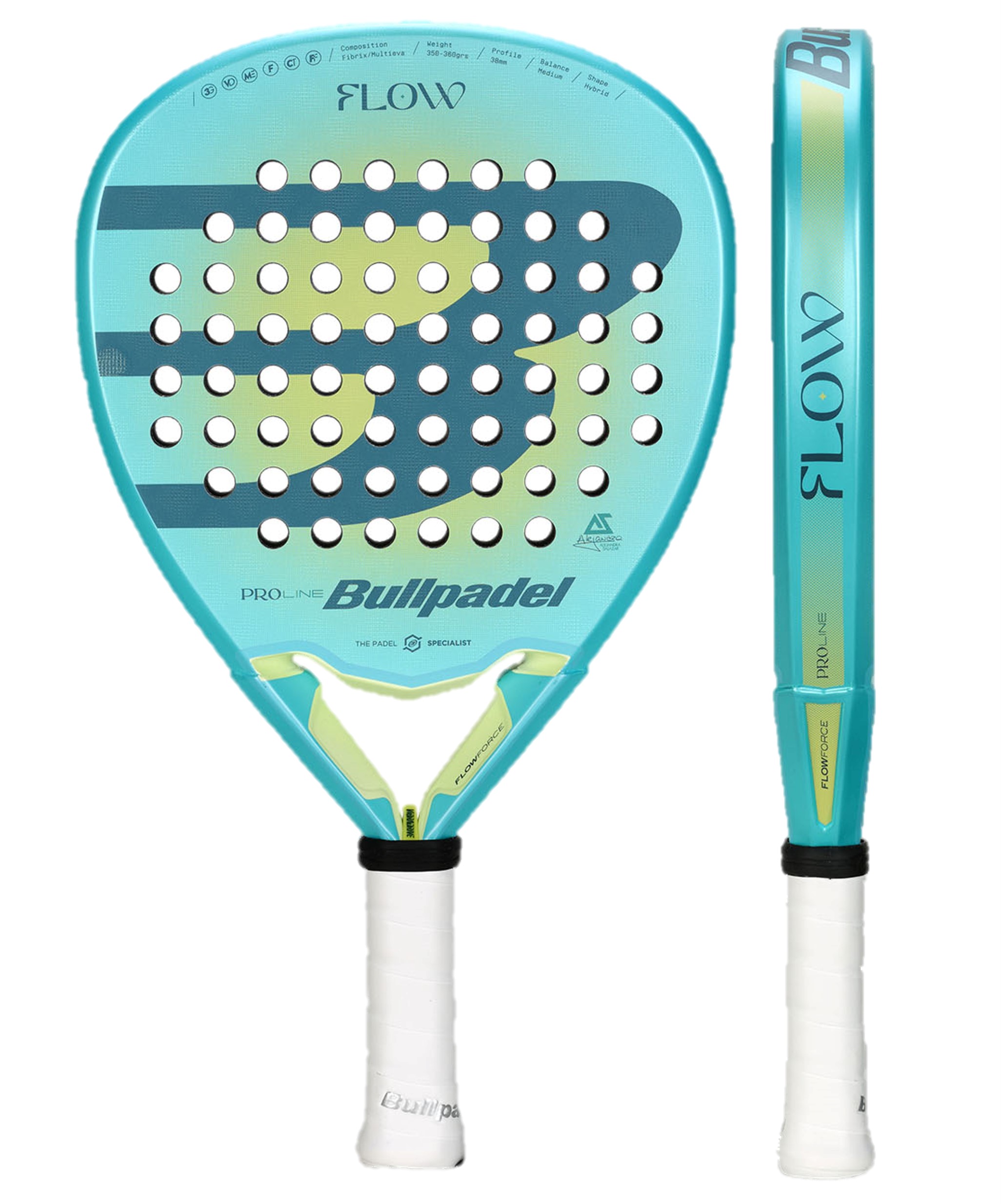 Het Flow racket heeft een laatste constructie aan de buitenkant met Fibrix, een combinatie van flexibele glasvezels en stijf carbon, wat zorgt voor een zachter en toegankelijker gevoel, waardoor de bal er sneller uit kan. Dit zorgt voor een gemakkelijke en effectieve respons, waardoor je met vloeiendheid en vertrouwen over de baan kunt bewegen.