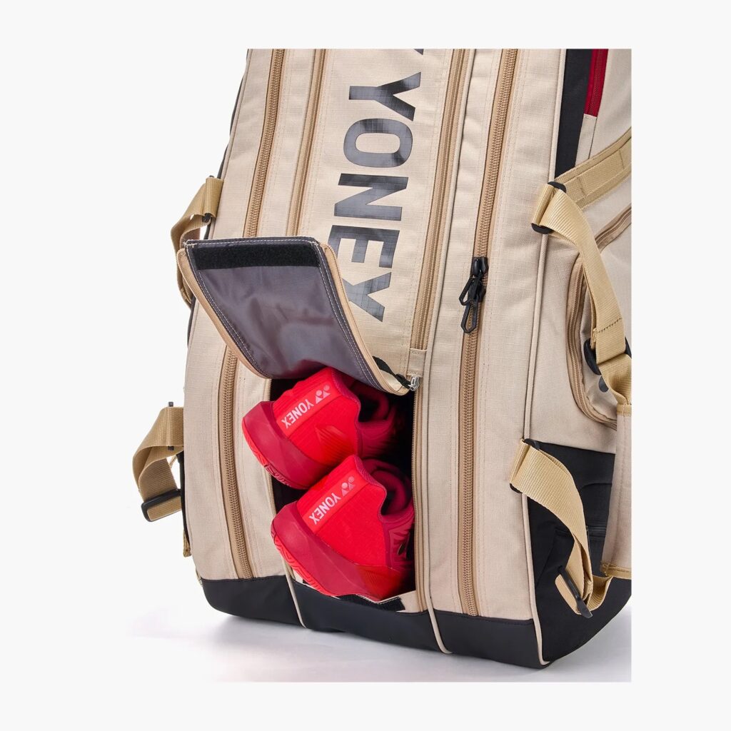 Schoenenvak: Een apart geventileerd vak om schoenen gescheiden te houden van kleding en rackets.